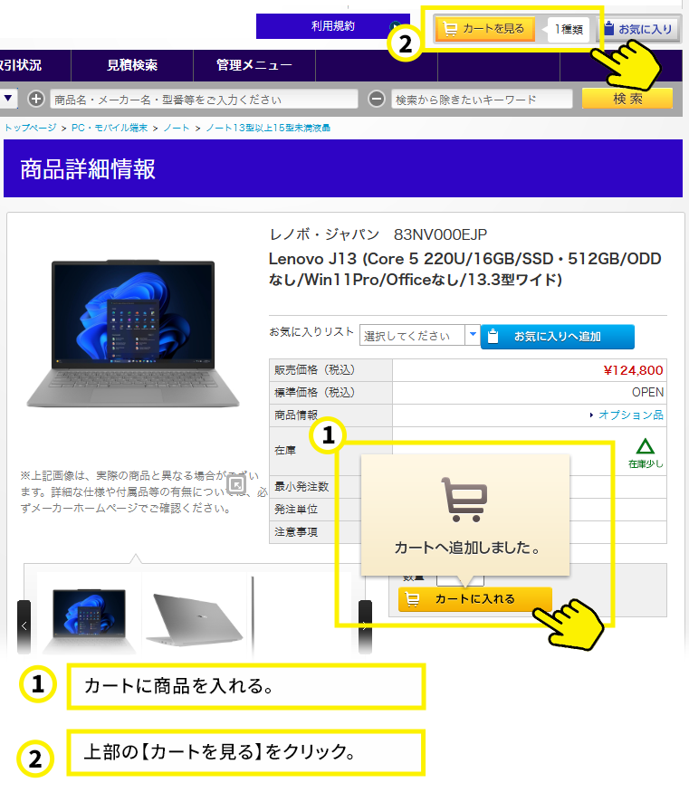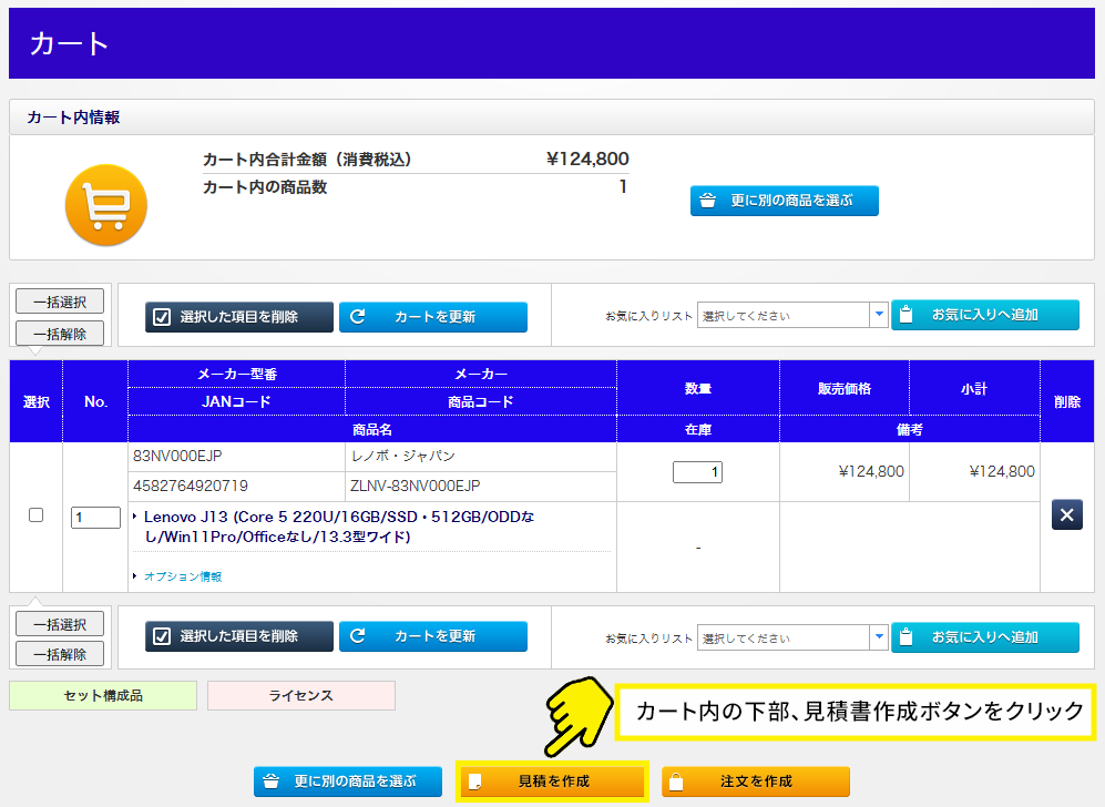 お見積書の発行後、カートに入れた商品が非表示になります!