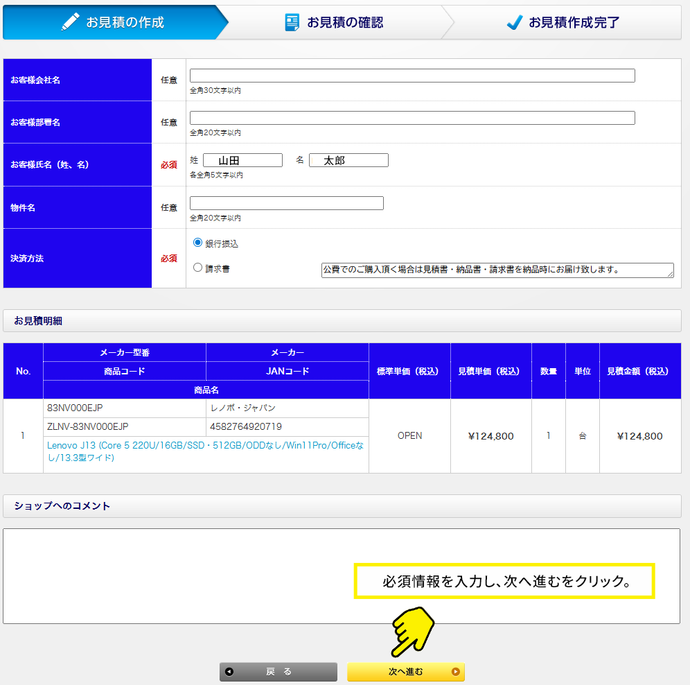 見積を作成ボタンをクリック