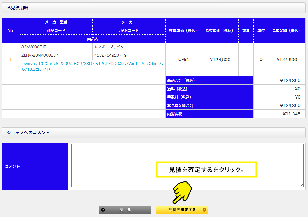 お見積明細を確認後、見積確定をクリック