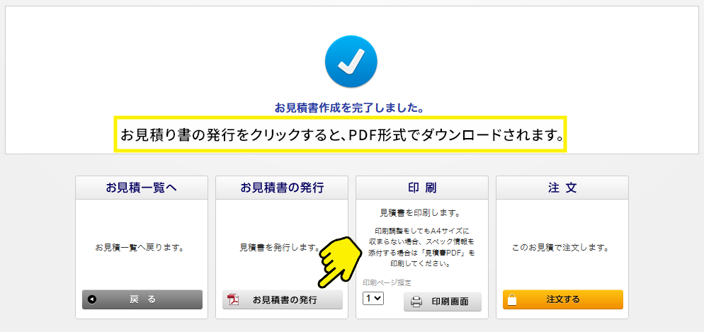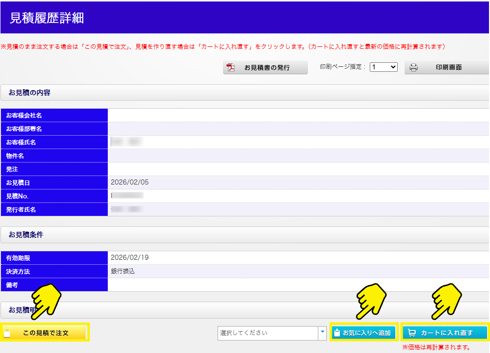 画面下部に表示される【この見積で注文】【お気に入りへ追加】【カートに入れ直す】いずれかを選択してください。