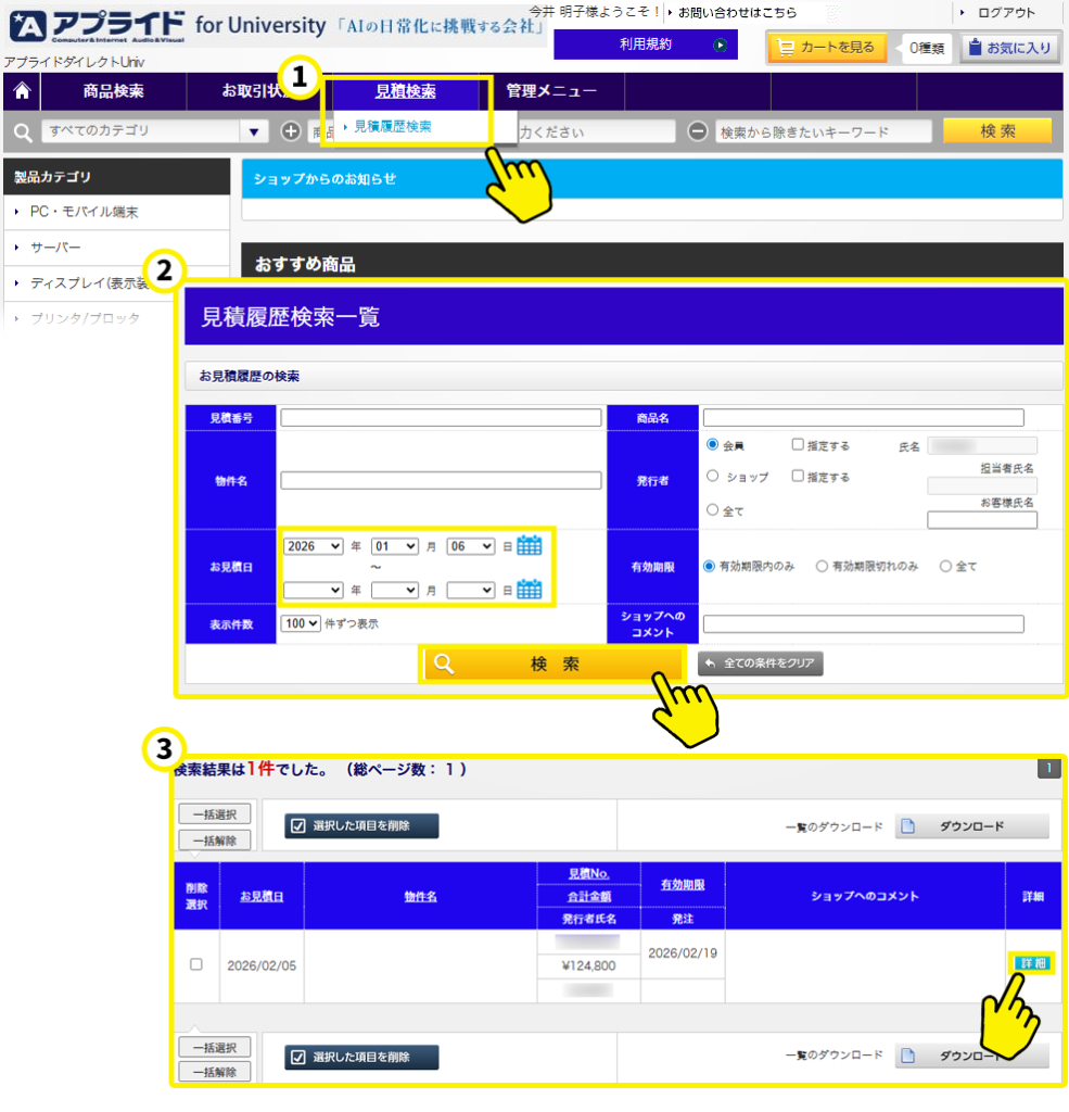 ③検索結果画面の右端【詳細】をクリック